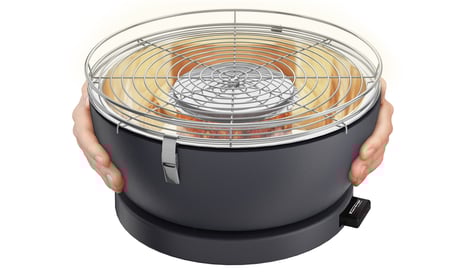 Das Gehäuse (4) und der Boden sind aus pulver-beschichtetem Stahl hergestellt, der integrierte Sockel (4) sorgt für einen sicheren Stand. Eine doppelwandige Ausführung der Außenschale sorgt dafür, dass das Gehäuse des Grills von außen nicht heiß wird und der Grill während der Anwendung angehoben und versetzt werden kann.
